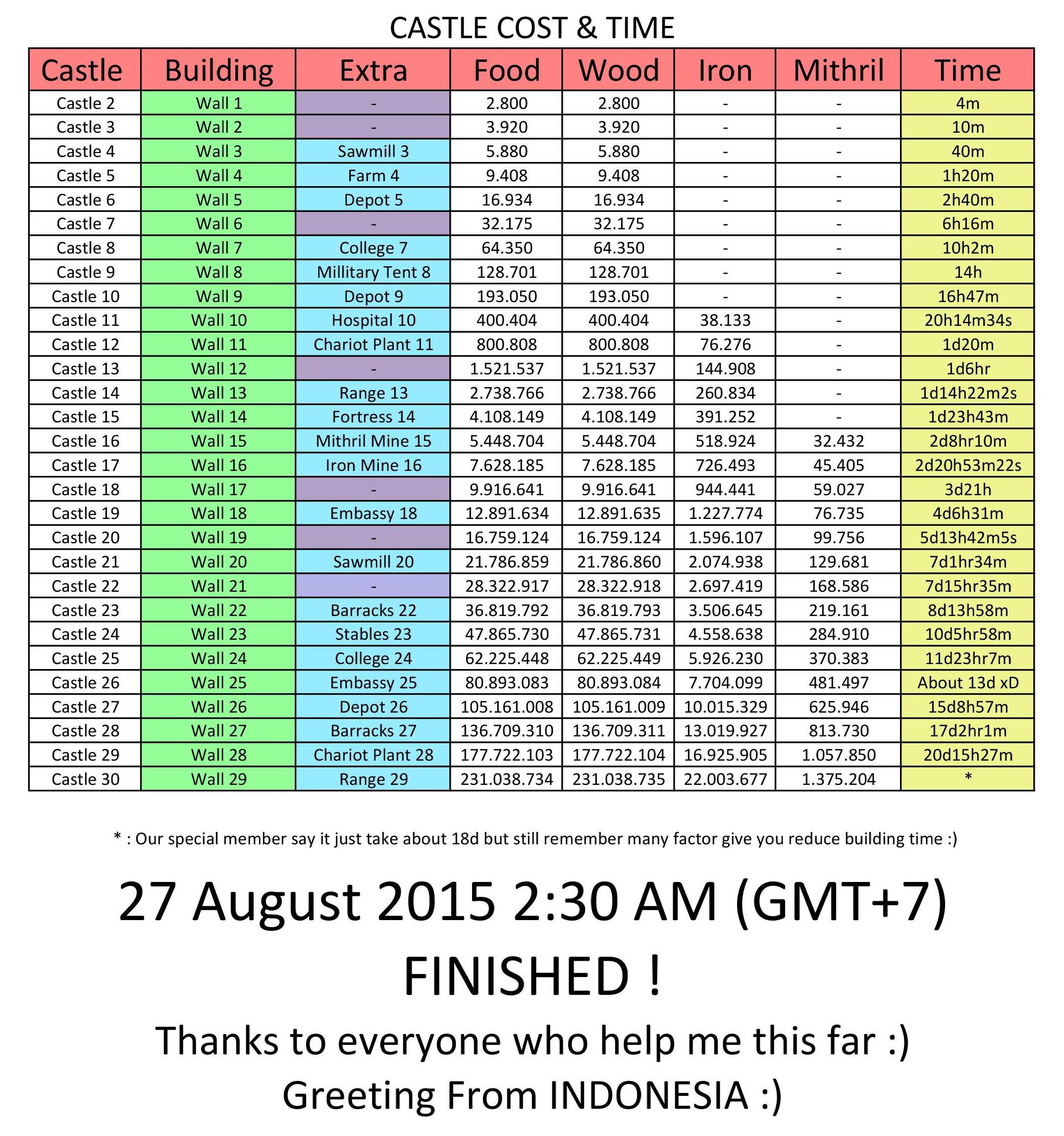 امروز قصد داریم، جدولی فوق العاده مهم برای دوستانی که قصد دارند مقدار دقیق ارتقا دادن سطح کستل (قلعه) خود را بدانند قرار بدیم. با استفاده از این جدول می توانید از زمان و منابع مورد نیاز سطوح مختلف قلعه خود آگاهی پیدا کنید.