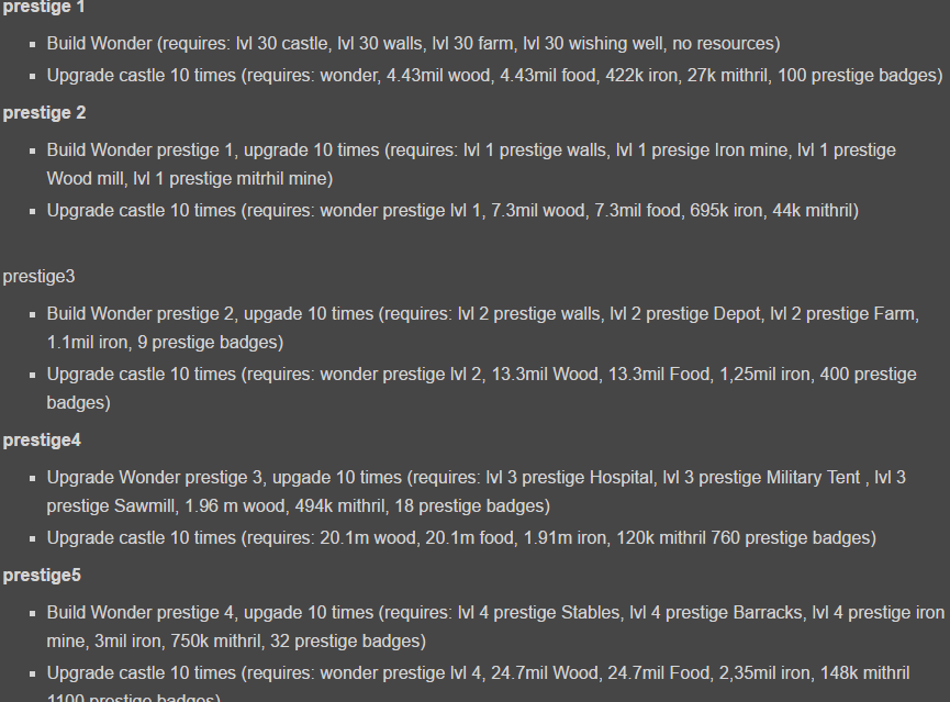 دوستان عزیز، در این عکس می توانید اطلاعات دقیق در رابطه با پیش نیاز ها و منابع مورد نیاز برای سطوح مختلف پرستیژ را مشاهده کنید. منظور از عبارت 10 time در داخل عکس، این هست که یعنی شما باید ساختمان مورد نیاز را ده بار ارتقا دهید و هر یک بار، x مقدار نشان شهرت و x مقدار چوب، گندم، آهن، نقره نیاز دارد.